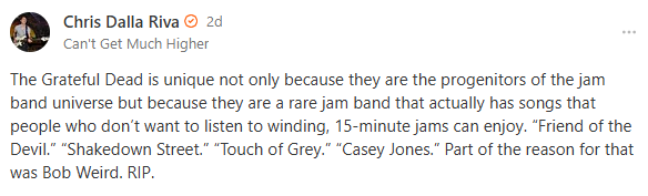 That we lost Bob Weir this week won’t be news to anyone here. I noted a few days ago that it was frankly refreshing to see my TL flooded with remembrances from all corners. I don’t know what it says about 2026 that mourning was a nice change, but here we are.